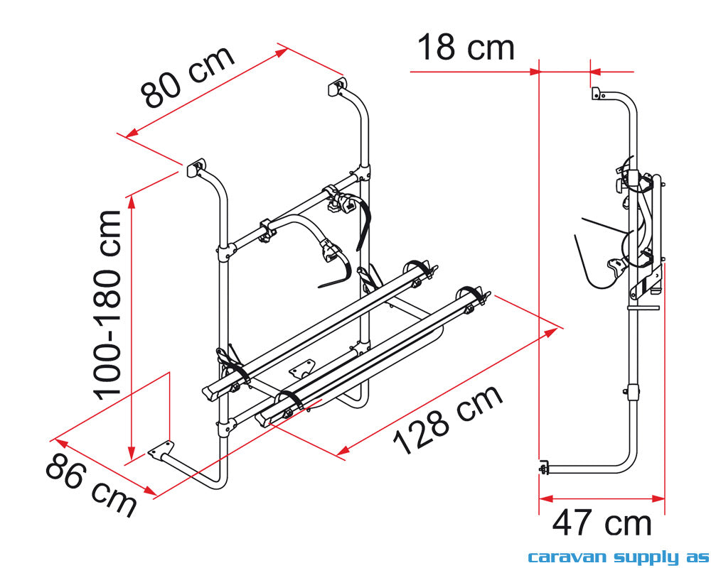 Passer til montering på bakveggen til campingvogner f.eks. Bürstner, Chateau etc. Monteres i chassiset. Teleskopiske rør som kan justeres fra 100-180cm i høyden. Laget av anodisert aluminium og skruene er av rustfritt stål. Følger med fester.