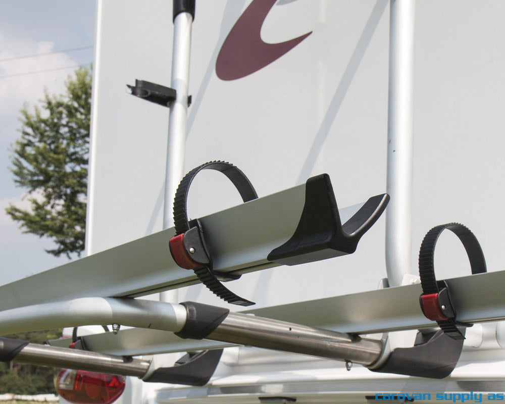 Passer til montering på bakveggen til bobiler. Høye fester med teleskopiske rør som kan justeres fra 80-150cm i høyden. Laget av anodisert aluminium og skruene er av rustfritt stål. Følger med fester og sikkerhetsbånd på 2m.