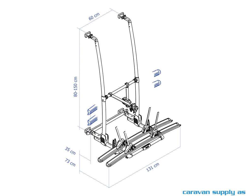 Monteres på bakveggen til bobil og campingvogn. Høye fester som kan justeres fra 80-150cm i høyden. Skinnene kan justeres i dybden og sideveis. Plattformen syklene står på sikres slik at stativet er stabilt under transport. Anodisert aluminium. Fester følger med.