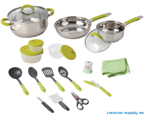 Smart og praktisk kjøkkensett som inneholder det mest grunnleggende utstyret for ditt mobile kjøkken! Kan brukes på gass, elektrisk og keramisk koketopp.