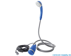 Smart og enkel reisedusj! Senk synkepumpen ned i vannkannen og koble til 12V kabelen. Perfekt til å ta en oppfriskende dusj, rengjøre sykkel, vaske kjøretøy, vaske hunden eller for oppvasken etter et måltid. Solid kvalitet og tar liten plass å oppbevare. Inneholder dusjhode med 5m slange, 12V synkepumpe, sugekopp for dusjhodet, kabel med 12V plugg og bag.
