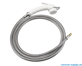 Med 2m slange i metall og stoppgrep. Farge hvit.