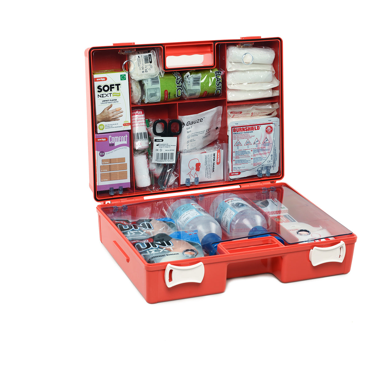 Denne kofferten inneholder 25 forskjellige typer for førstehjelpsutstyr. Førstehjelpsskrinet kan enkelt fylles opp ved hjelp av innholdsposer. Kofferten er utstyrt til å klare både mindre og større ulykker og er en must-have med tanke på sikkerhet. Blant produktene som er inkludert er deriblant følgende: