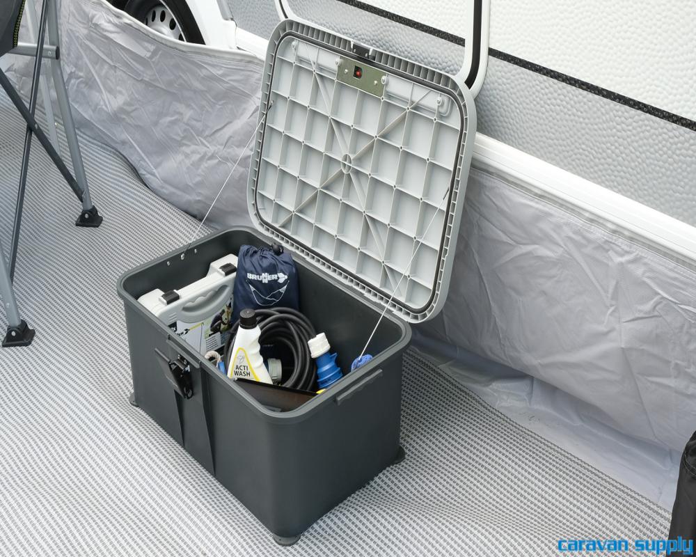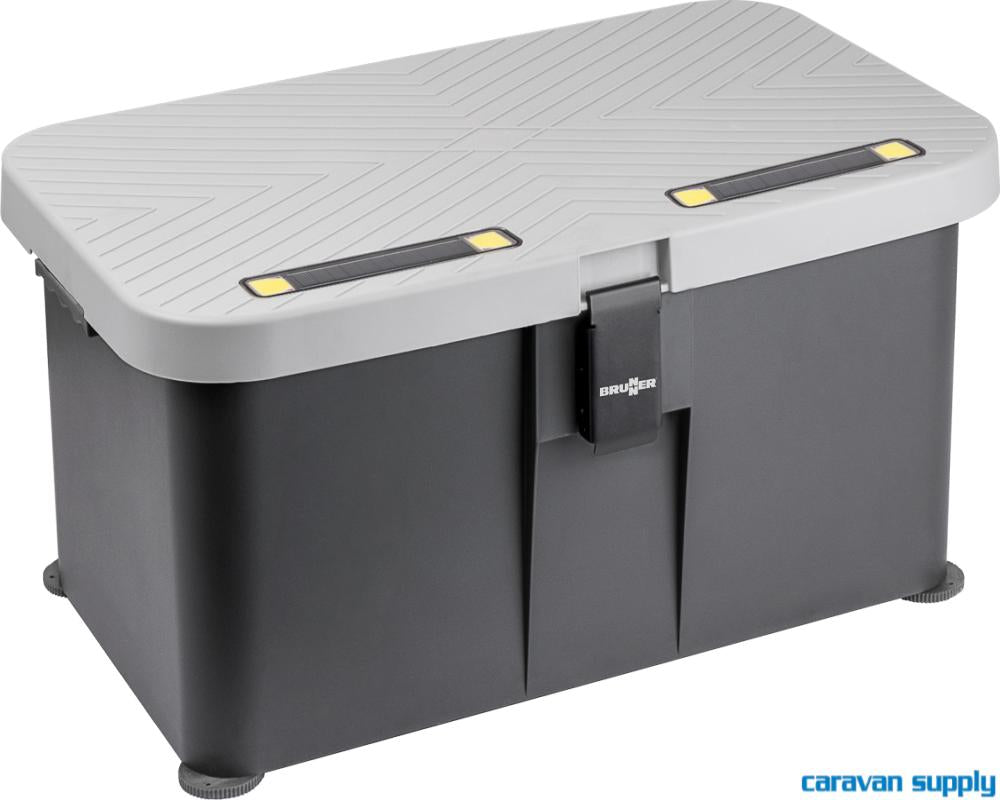 Trinn i aluminium med innvendig plass til bobiltilbehør. Det låsbare lokket har en sklisikker trinnflate og er i tillegg utstyrt med et integrert, solcelledrevet sikkerhets- og orienteringslys.