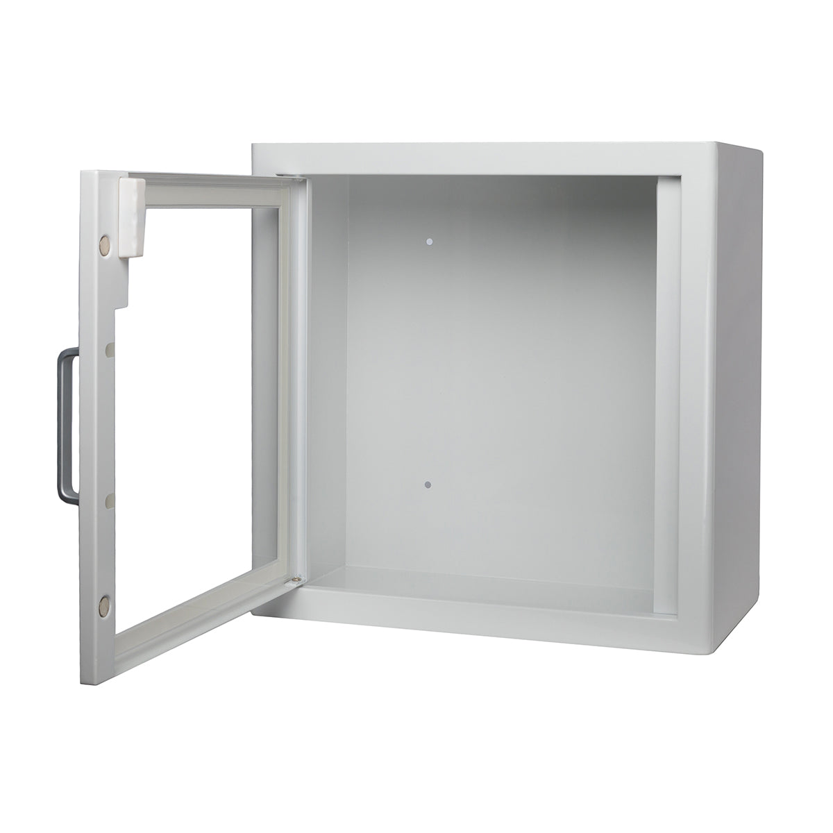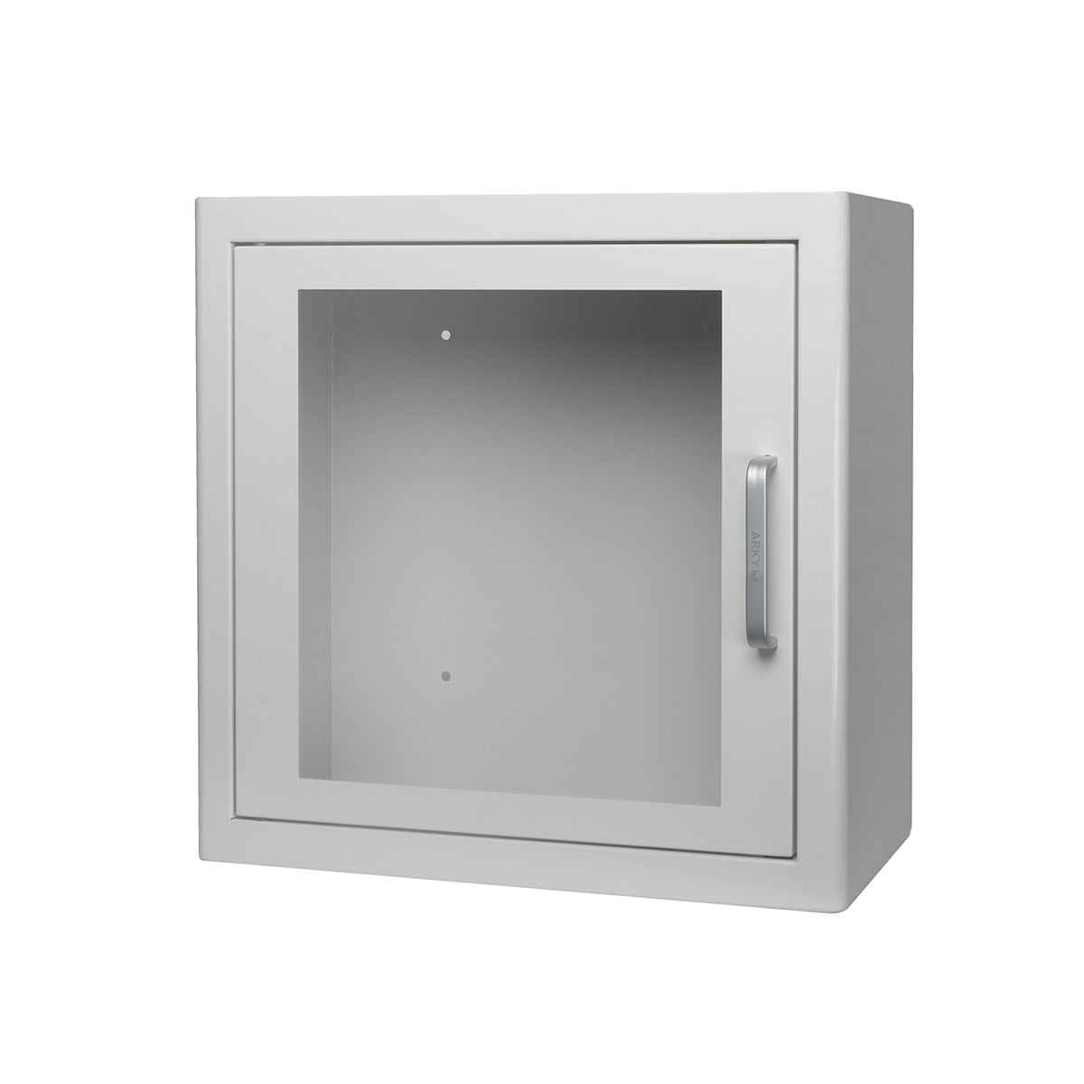 Innendørs veggskap til hjertestarter. Skapet har dimensjoner på 38x38x20cm og et volum på cirka 28,5 liter. Skapet har alarm som aktiveres når døren åpnes. Alarmen kan deaktiveres.