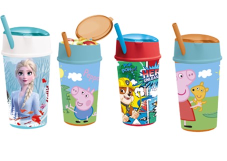 Drikkekopp med snack rom. Tilgjengelig i 3 forskjellige motiver: Frost, Paw Patrol og Peppa Gris.