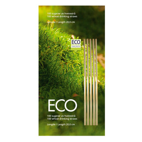 Miljøvennlige Sugerør laget av hvetestrå. Når hveten blir høstet, blir stråene tatt vare på. Disse blir vanligvis brukt som brensel, så dette er en flott måte å bruke de på. De gjennomgår så en grundig vask før de blir kuttet til ønsket lengde og pakket. Pakken inneholder 100 sugerør som er 20 cm lange. Diameteren vil variere ettersom planten varierer. Ca diameter er 3,5-4,5 mm.