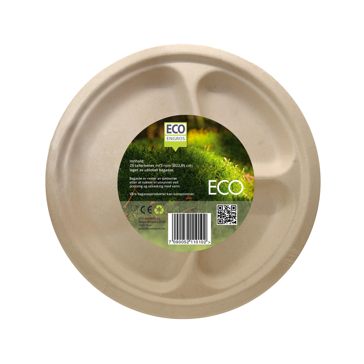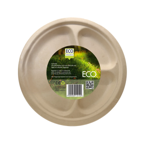 Stor, miljøvennlig tallerken med flere rom laget av bagasse. Et perfekt alternativ når man ønsker en mer miljøvennlig engangs-asjett. Bagasse er fibrene som er igjen etter sukkeret er presset ut av sukkerplanten. Et perfekt eksempel på hvordan man kan gjenbruke råvarer som vanligvis blir brukt som brensel eller kastet. Tallerkenene er selvfølgelig godkjent for å være i kontakt med næringsmidler. Hver pakke inneholder 25 stk tallerkener med 3 rom (22,9cm diameter), laget av bagasse. Egner seg godt til hovedrett, enten det er hjemme, på tur eller i en kafeteria.