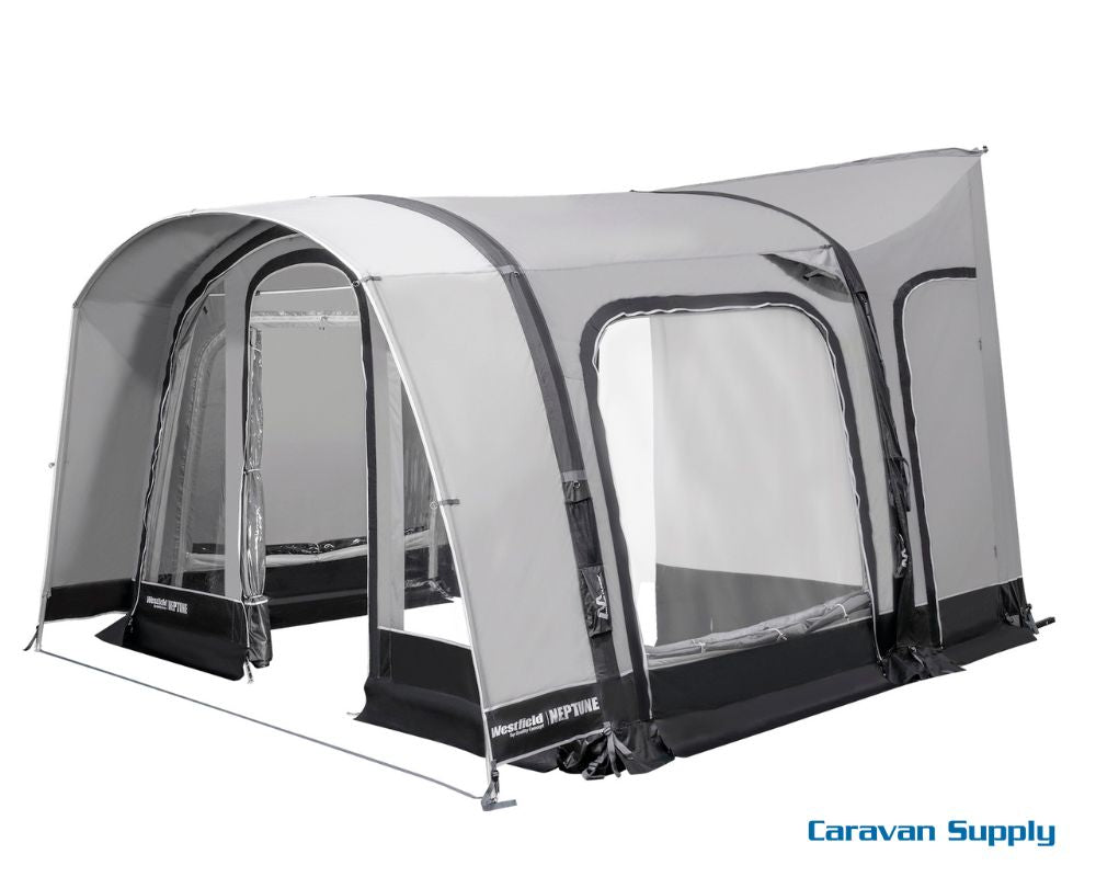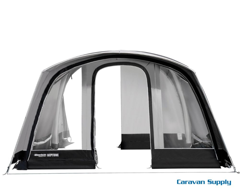 Westfield Neptune 400 er et kvalitets drive-away luftfortelt som er designet med tanke på eiere av høyere bobiler. Det finnes sluser i tre høydealternativer (kjøpes separat) som gjør den egnet for kjøretøy med en monteringshøyde mellom 240 - 300 cm. Slusen til forteltet har glidelås som betyr at du ikke lenger trenger et drive-away kit, samtidig som det gjør det enklere å sette opp. Hvis du bestemmer deg for å bytte kjøretøy, kan du kjøpe en ny sluse/connector med en annen høyde uten å måtte kjøpe et helt nytt fortelt.