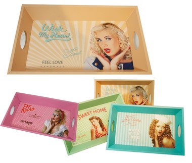 Retro serveringsbrett. 38 x 24 x 5 cm. Tilgjengelig i 4 forskjellige farger: Blå, grønn, gul og rosa.