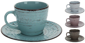 Servise kopp og skål. Tilgjengelig i 4 forskjellige farger: Blå, brun, grå og lilla.