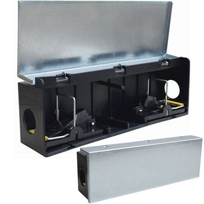 Musefeller (2stk) av kvalitetsfeller av type Quick Snap musefeller, som er integrert i en driftssikker og proff åtestasjon. Kan brukes både inne og ute. Stasjonen er i slagfast plast med galvanisert lokk.