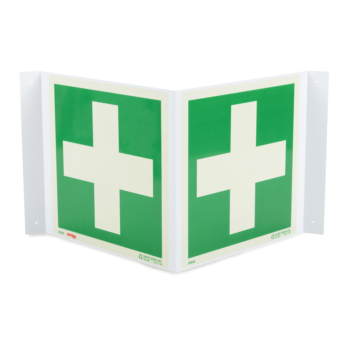 Markeringsskilt for førstehjelp-utstyr. Henges opp på samme vegg som førstehjelps-utstyret.