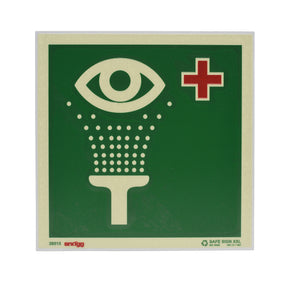 Markeringsskilt for øyeskylle. Henges opp på samme vegg som øyeskyllestasjonen. 20 x 20 cm.