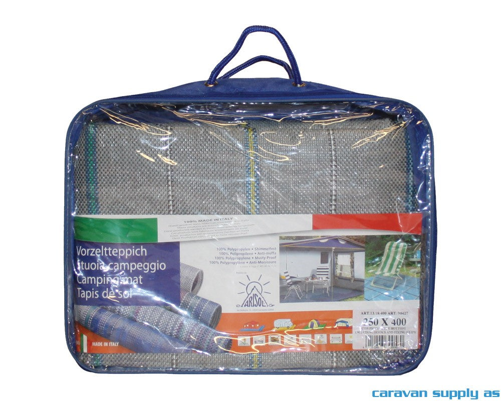 Et pustende og slitesterkt teltteppe fra Arisol som er UV-bestandig og motstandsdyktig mot vann. Det gjør at fargene ikke blekner og at kvaliteten holder seg bra. Teppet har en glatt overflate og er behagelig å gå på, samt lett å rengjøre. Laget av 100% polypropylen resirkulerbar fiber. 300gr/m2. En praktisk oppbevaringsbag følger med.