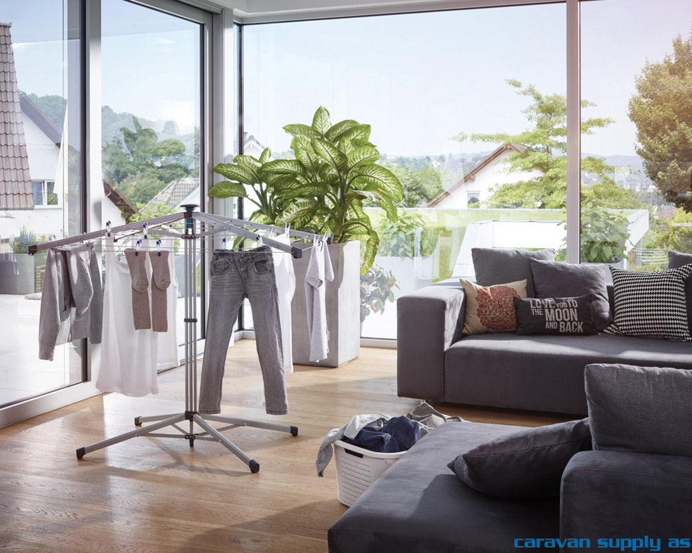 Tørkestativet tar liten plass så det er lett å oppbevare. Perfekt for bruk på camping, hytta eller hjemme!