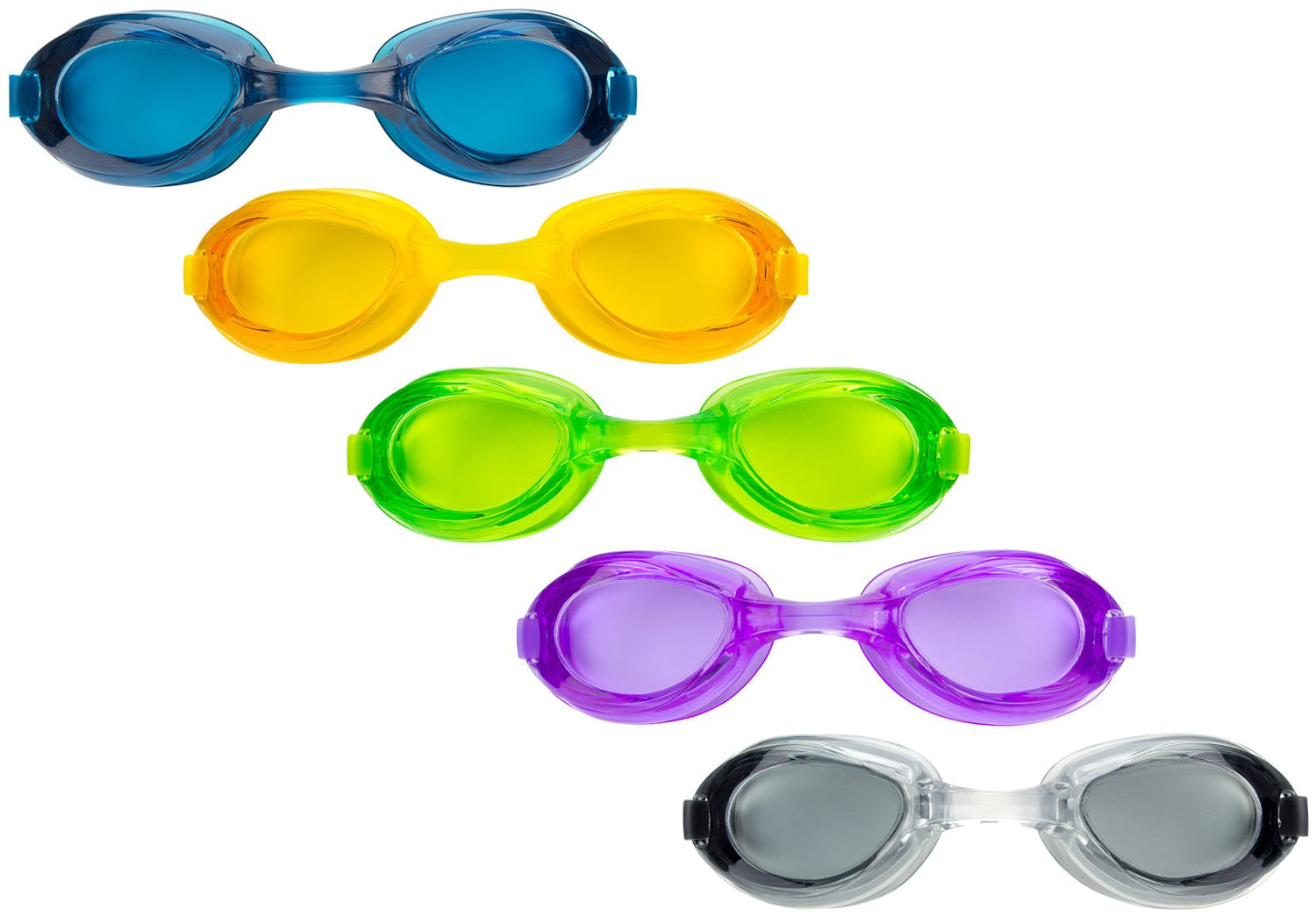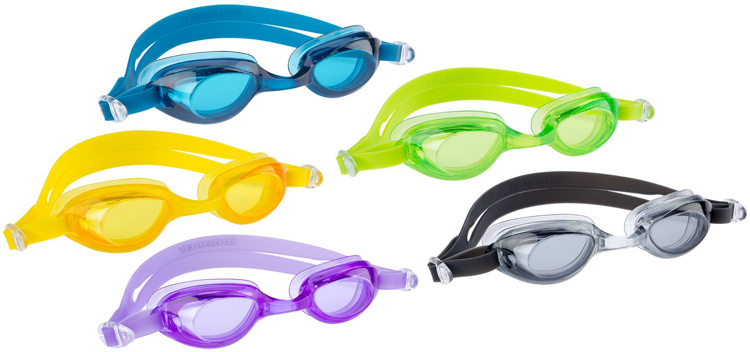 Klassiske svømmebriller "googles" gjort i silikon og polycarbonate i 5 spenstige farger til junior. UV-beskyttende.