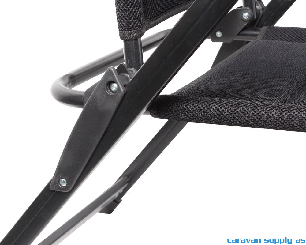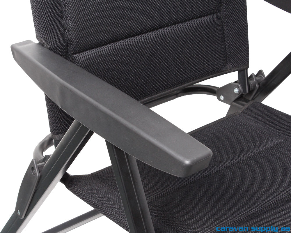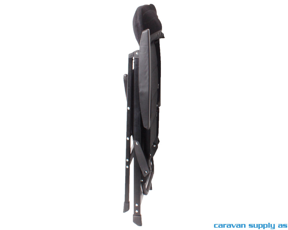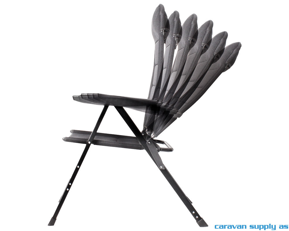 Sammenleggbar campingstol med aluminiumsramme, samt pustende og polstret 3D stoff i 100% polyester. Ryggen er justerbar i 6 posisjoner og har en integrert polstret nakkestøtte. Armlener i robust plastmateriale. Det er mulig å montere fotskammel som da må kjøpes i tillegg (varenr. CS75114). Kompakt og enkel å transportere sammenslått.