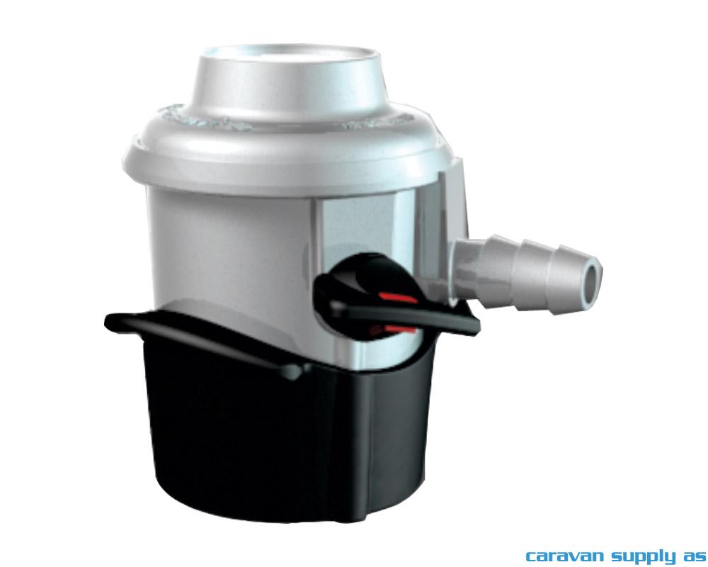 Click-on med 10mm stuss. Bruddsikring, samt to-trinns regulering. Av/på bryter på siden gjør at regulatoren ikke kan tas av gassflasken under bruk når bryteren står “på” med det røde symbolet vendt opp. Flow 1,5 kg/t. 29mbar.