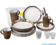 Laget av melamin av høy kvalitet og har en veldig hard, støtbestandig overflate som er motstandsdyktig mot varme og fuktighet, er smak-og luktfri, samt kan fryses. Lett å rengjøre, og kan vaskes i oppvaskmaskin. Antiskli-ring. Leveres i praktisk plastboks. Farge hvit med brun dekor.