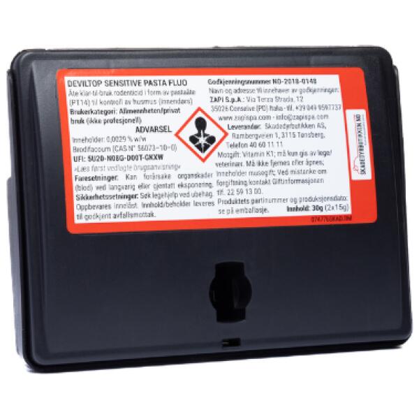 Deviltop Sensitive Fluo musegift med sporingspasta er et effektivt og brukervennlig middel for rask og målrettet bekjempelse av mus innendørs.