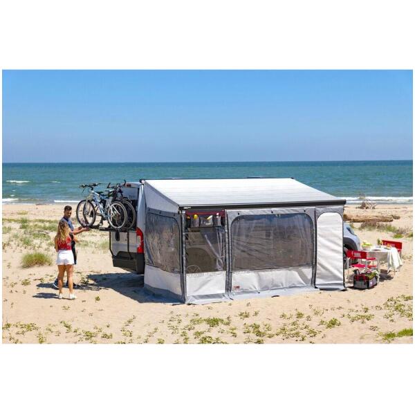 Klassisk og egnet for alle årstider, god løsning for mellom-og langtidsopphold. Perfekt for bobiler, campingvogner, varebiler og minivaner, den består av frontpanel og to sidepaneler, opprullbare krystallglassvinduer, myggnett og gardiner som standard.